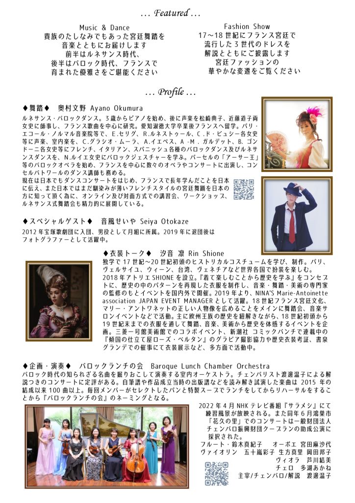 管弦楽組曲は、特にドイツ語圏で著しい発展をみせましたが、そのきっかけはフランスで花開いた宮廷舞踏が伝わったことにあります。この公演では、フランスの宮廷文化を多角的にとらえるために、王侯貴族がまとっていた歴史的衣装と、彼らが実際に見たり踊ったりした宮廷舞踏をご覧いただき、当時の宮廷文化を視覚と聴覚を通して感じていただければ幸いです。