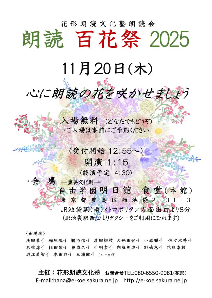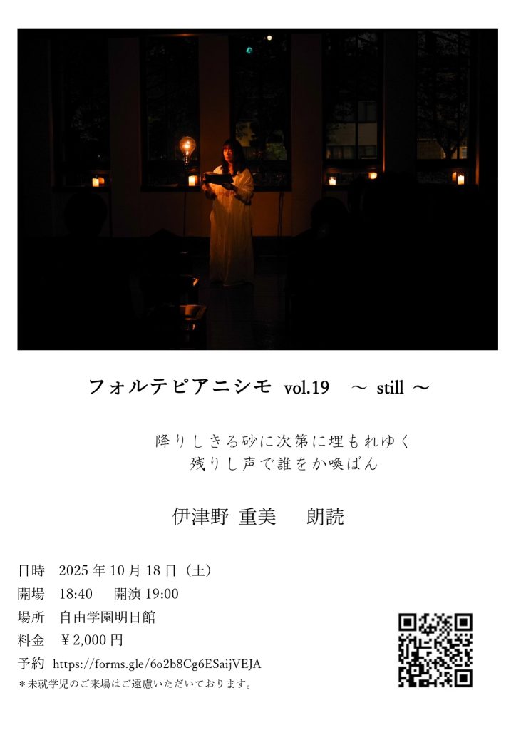 2007年より朗読ライブシリーズ「フォルテピアニシモ」を開始する。空間と時間までも<詩>へと昇華させる朗読は、祈りのようでもある。