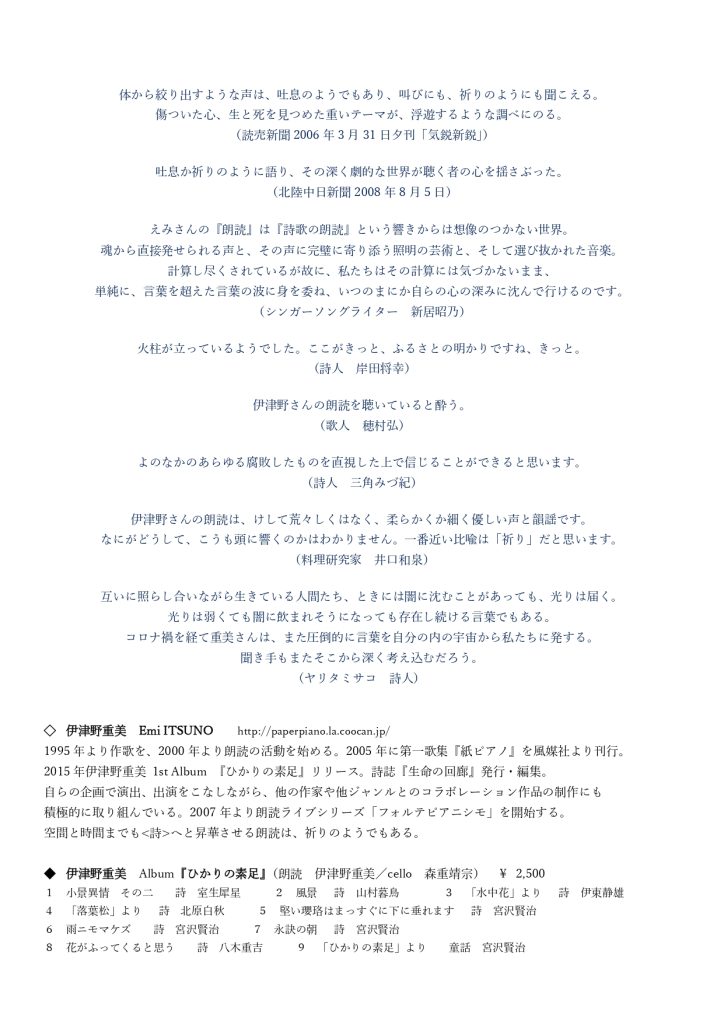 2015年伊津野重美 1st Album 『ひかりの素足』リリース。詩誌『生命の回廊』発行・編集。