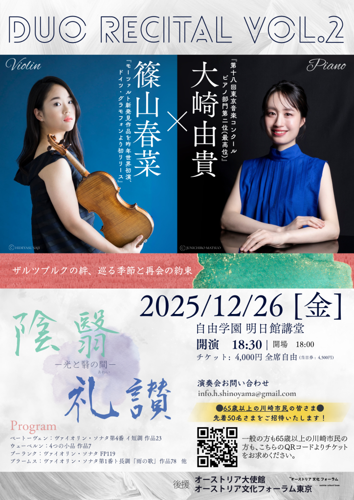 ザルツブルクでの留学時代を共に過ごした二人。 音楽とともに歩んだ日々の記憶を胸に、それぞれが現在は異なる場所で経験を重ねながら、日本でのコンサートを通じて“再会”を形にします。 そして、二人が積み重ねてきた時間や、それぞれの変化を音に映し出すコンサートをシリーズ化! 「ザルツブルクの絆」を原点に、心あたたまるひとときをお届けします。 応援のほど、よろしくお願いします。
